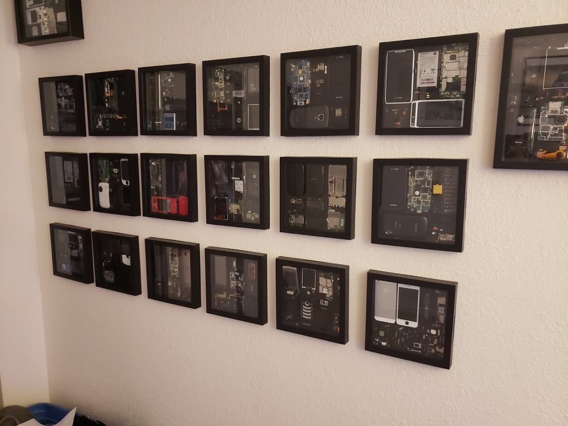 A Reddit user under the pseudonym JediSamReye2013 as a hobby parses smartphones and puts them in a frame. His collection joins iPhone 5 — the inside of the smartphone placed on exhibition the wall under the frame.